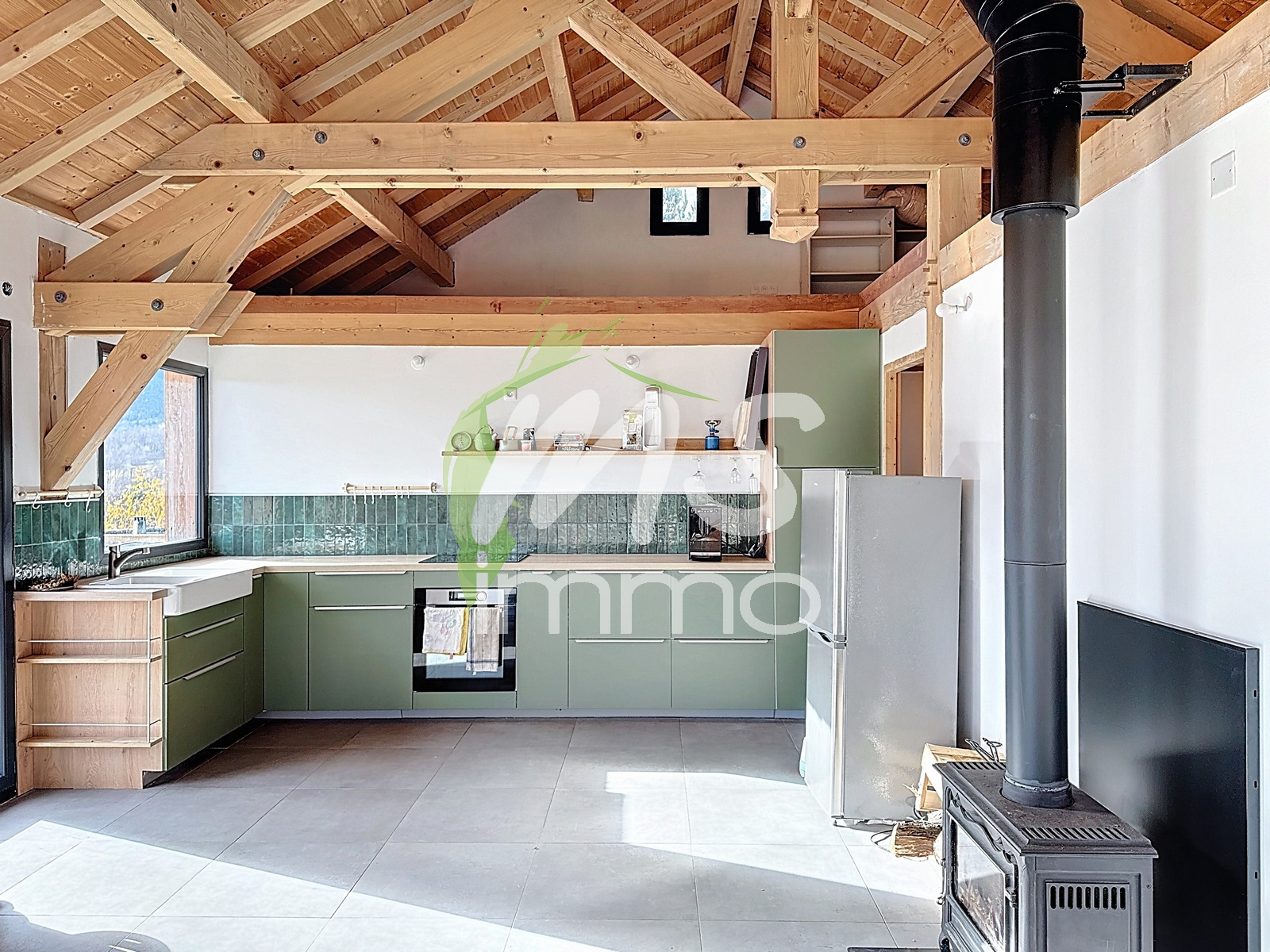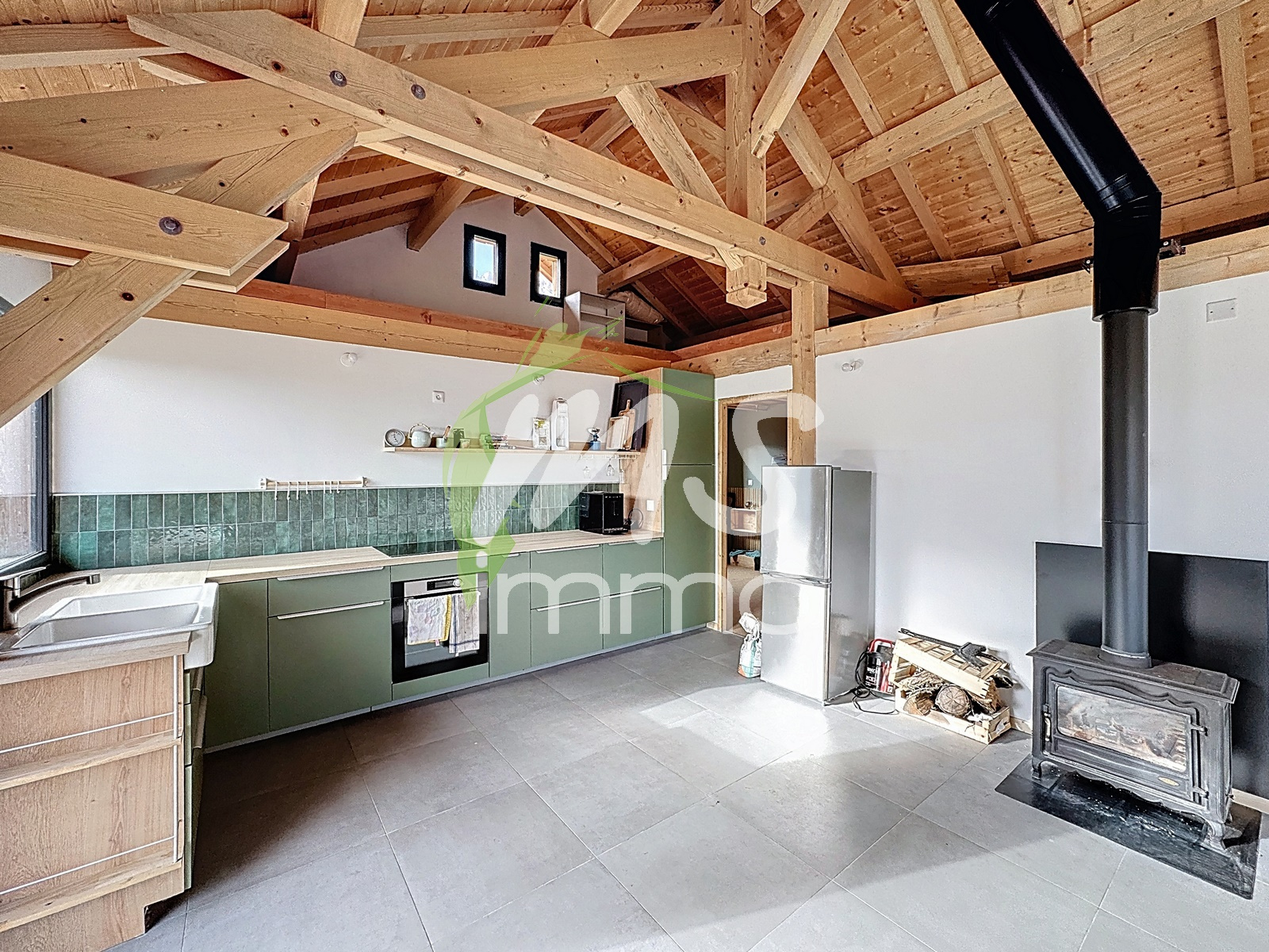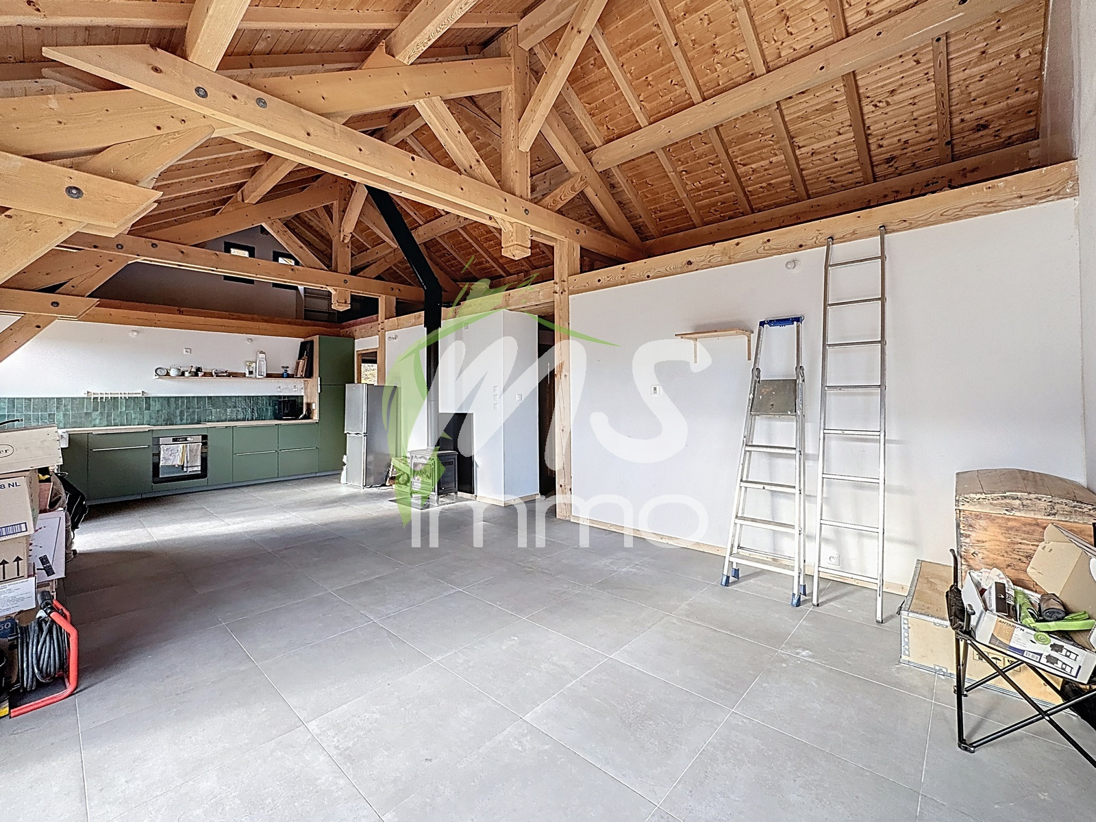 Construction récente. Chauffage par poêle à bois et plancher chauffant électrique.
