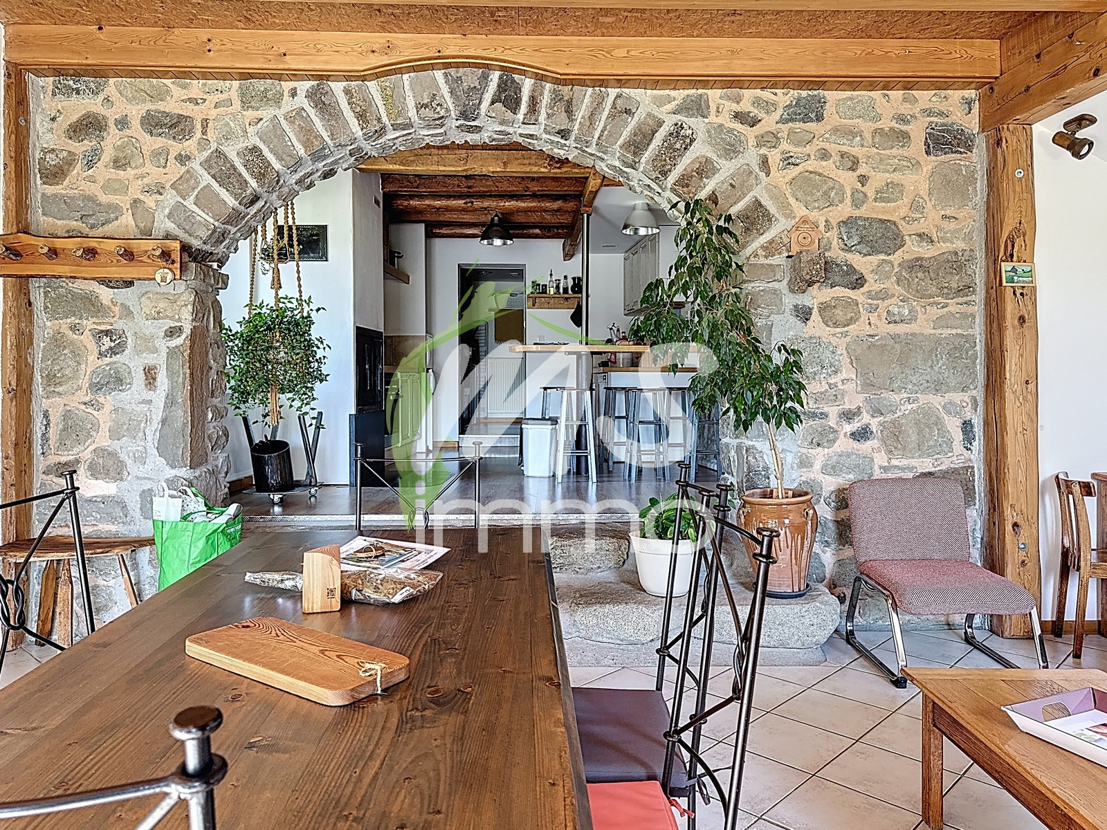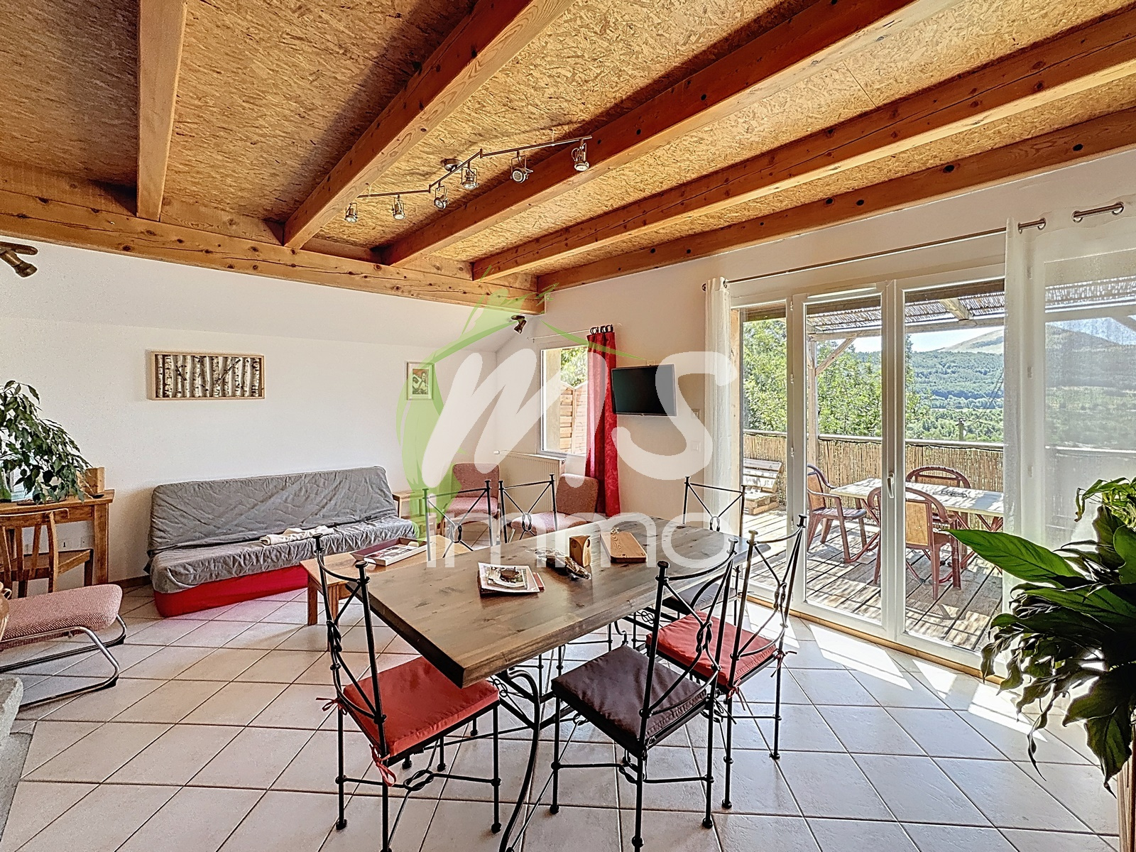 Elle offre un séjour lumineux avec cuisine équipée et poêle à bois, s’ouvrant sur une agréable terrasse exposée sud avec vue dominante sur la vallée.